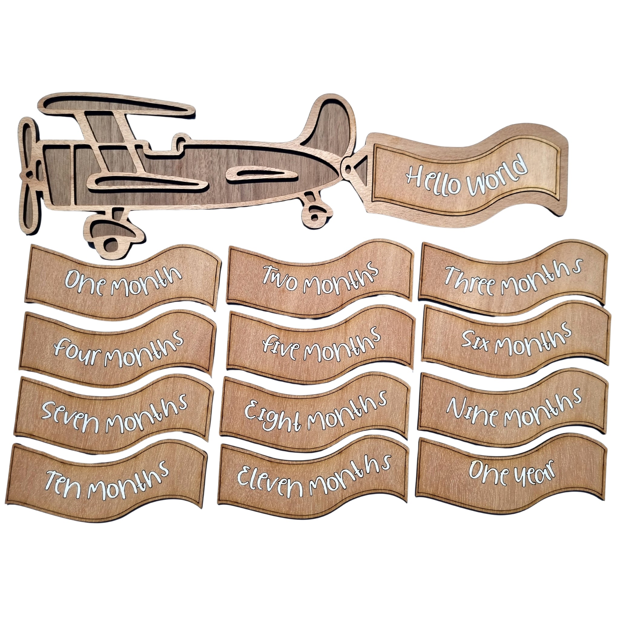 This digital file features a cute aeroplane pulling an interchangeable banner where the monthly milestone discs can be displayed. Comes with “Hello World” plaque + Month 1 to One Year discs.
